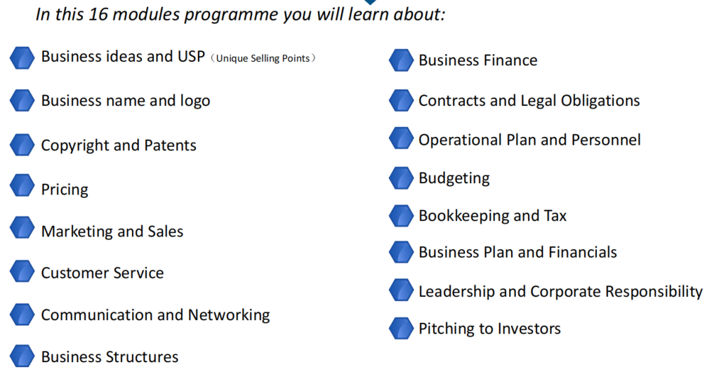 The KidsMBA Programme consists of 16 modules and is designed to give you an introduction to a variety of business skills. You will learn how to do business, how to structure a business and how to keep your business.
